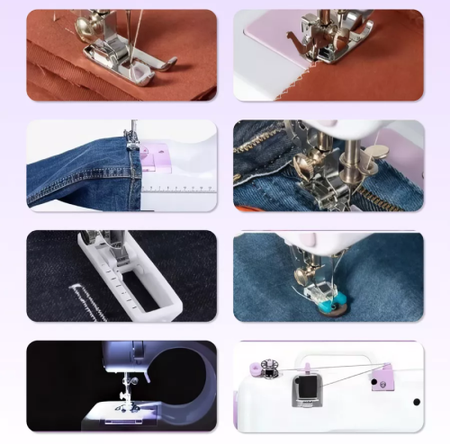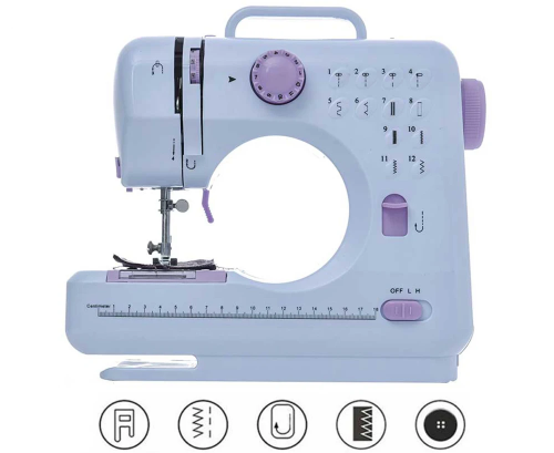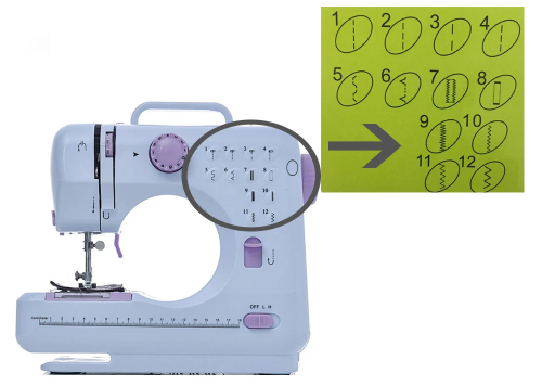 Швейна машинка має 12 базових типів рядків, загзаг, подвійний стібок, пряме та реверсне шиття.